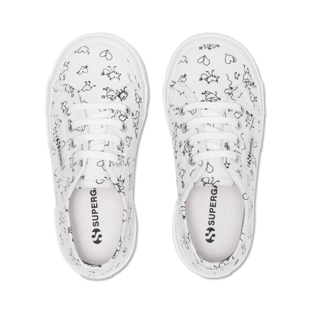הסופרגה 2750 לילדים: חלק עליון מכותנה מודפסת עם לבבות, בטנה מכותנה וסוליה חיצונית מגומי טבעי מגופר.